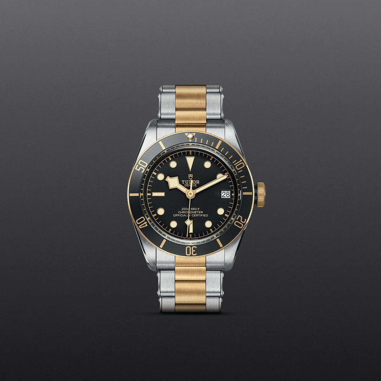 Enhancing the Black Bay with yellow gold creates a version named S&G, short for Steel & Gold. Tudor derived the characteristic aesthetic elements of the Black Bay S&G model from its history. The overall shape, as well as the domed dial and crystal, comes from the first Tudor divers’ watches. In this version, the lines and proportions of the Black Bay are retained, while the rotating bezel and the winding crown are made from yellow gold.